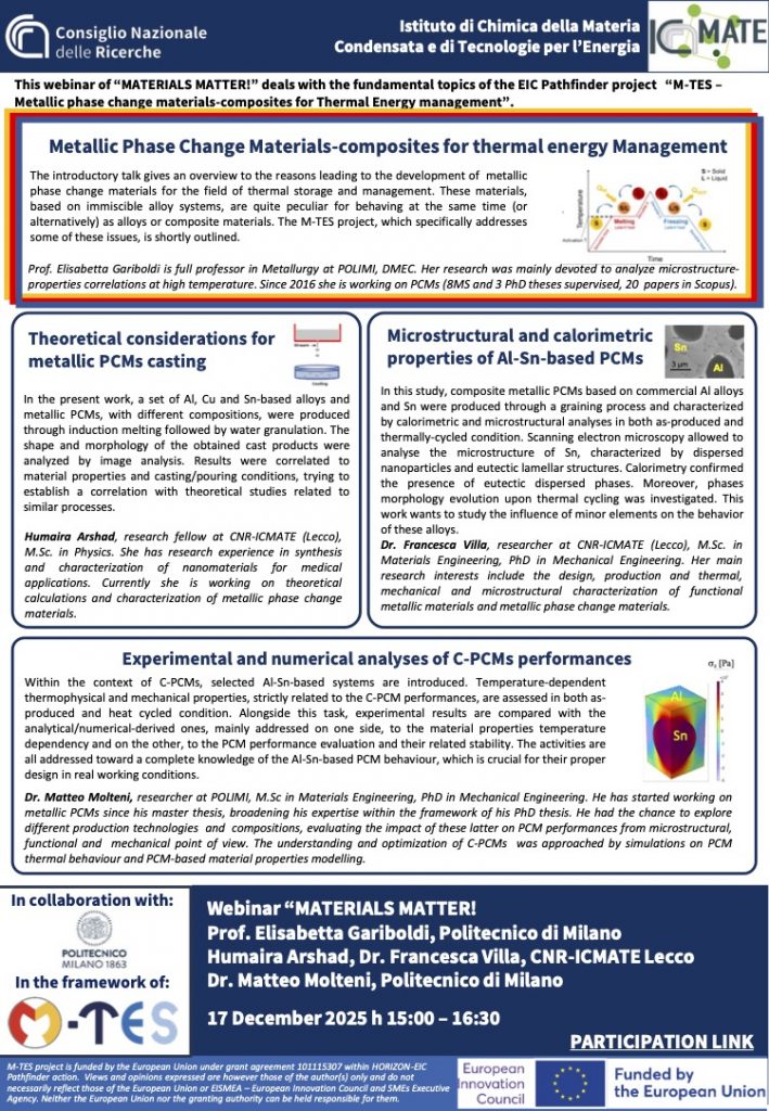As part of the project’s ongoing dissemination activities, several members of the research team will present specific issues related to Metallic Phase Change Materials Composites in the webinar series “Materials Matter”, organized by the CNR-ICMATE 17th December 2025, 03.00 p.m. CET.